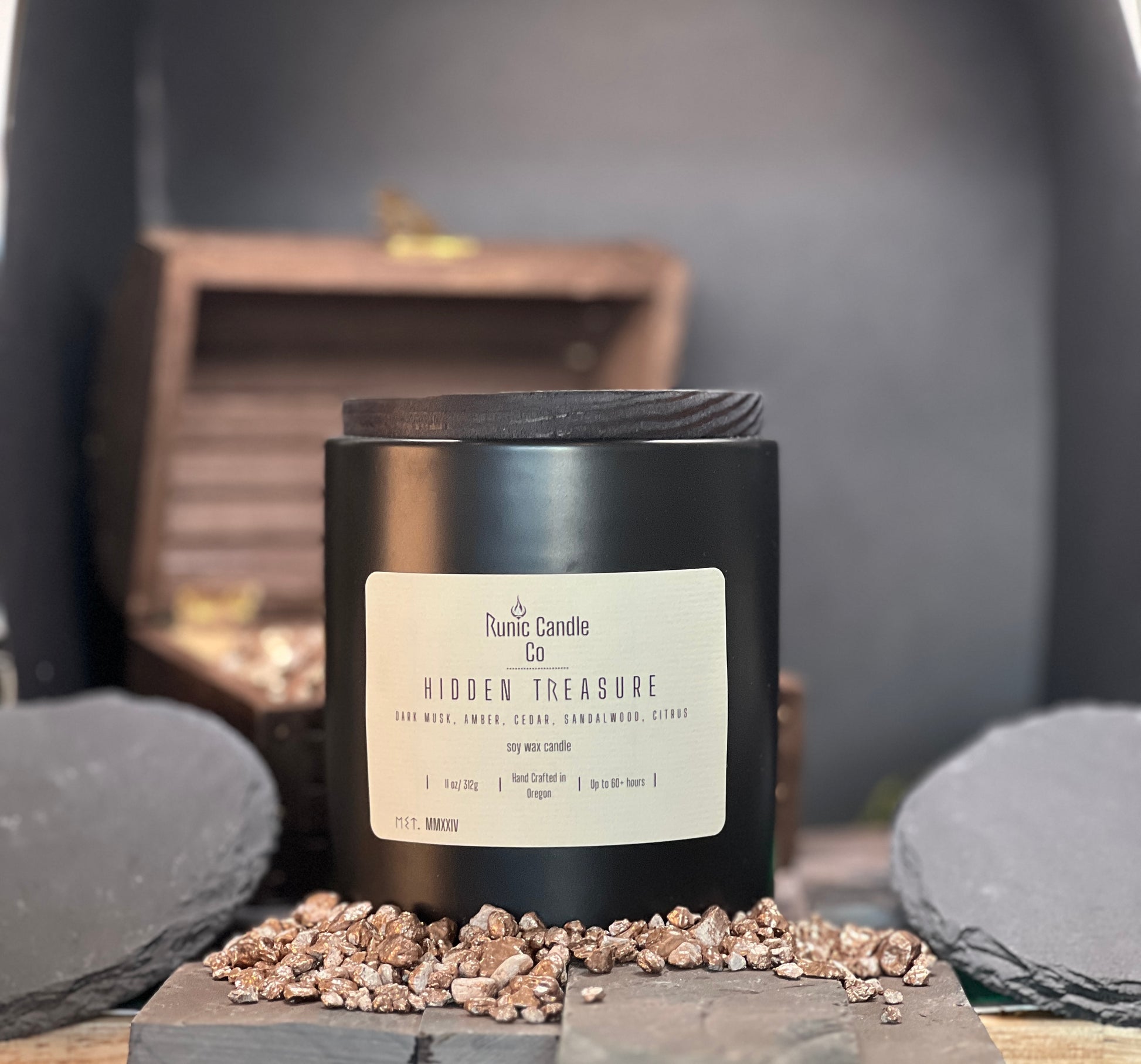 Hidden Treasure captures the thrill of the undiscovered: glints of gold in the shadows, the creak of ancient wood, and the hush before a trap is sprung. Zesty citrus sparks your senses, a flash of brightness against a rich blend of dark musk, warm amber, and weathered cedar. Sandalwood smooths it all into a luxurious finish—like treasure unearthed after a long, perilous quest.